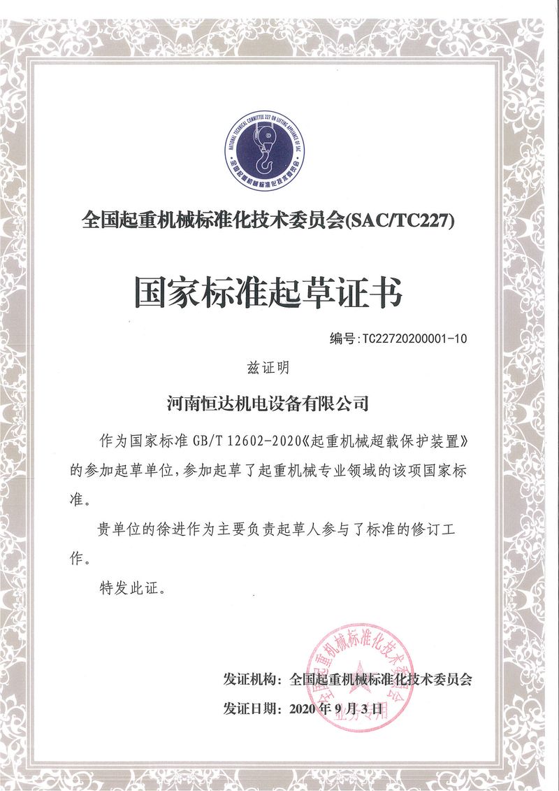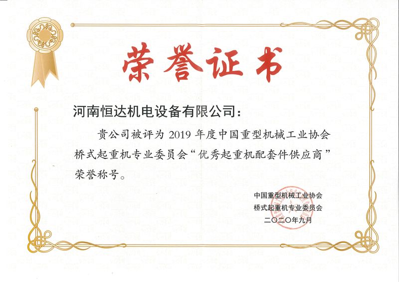 是中國重型機械工業(yè)協(xié)會橋式起重機專業(yè)委員會及葫蘆分會理事單位及多年的優(yōu)秀配套件供應商。物料搬運工程設(shè)備成套與服務分會理事單位,是ISO9001:2008質(zhì)量管理體系、武器裝備質(zhì)量管理體系、歐盟產(chǎn)品CE認證及兩化融合達標企業(yè)